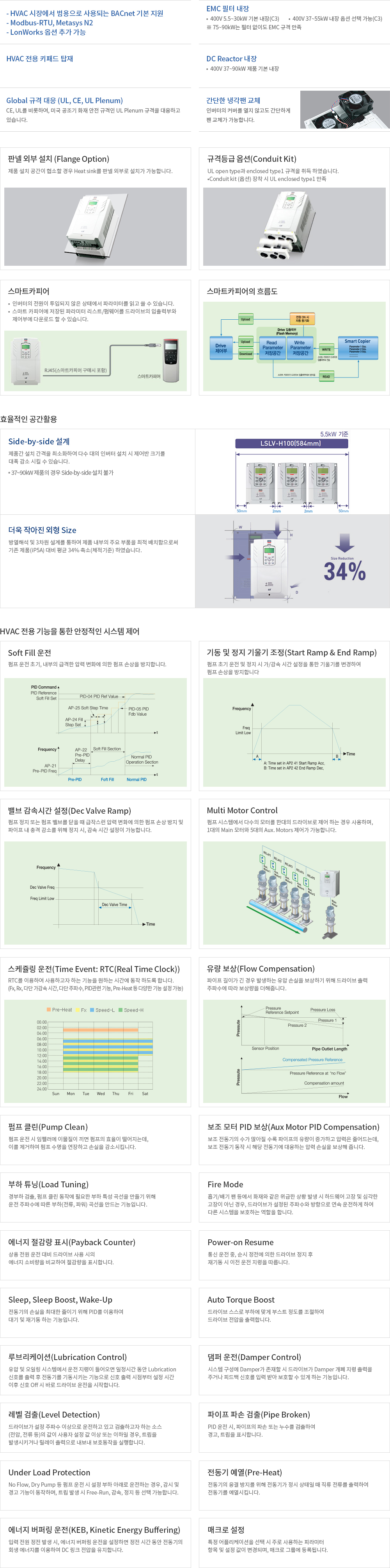 | 보호기능 | 트립 | 과전류,트립,외부 신호에 의한 트립,암(ARM)단락 전류 트립,과열 트립,결상 트립,지락 트립,모터 과열 트립,IO 보드 연결 트립,모터 없음 트립,파라미터 스기 트립,비상 정지 트립,지령상실 트립,외부 메모리 에러,CPU와 치독 트립,모터 경부하 트립,과전압 트립,온도 센서 트립,드라이브 과열,옵션 트립,출력 결상트립,드라이브 과부하 트립,팬 트립,운전 중 저전압 트립,저전압 트립,아날로그 입력 에러,모터 과부하 트립,파이프 손상 트립,기패드 지령 상실 트립, 댐퍼 트립,Level Detect 트립, 전체 보조모터 고장 트립,펌프 클린 고장 | ||