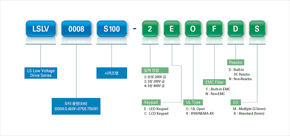 | 모델명 LSLV S100-4 | 0004 | 0008 | 0015 | 0022 | 0037 | 0040 | 0055 | 0075 | 0110 | 0150 | 0185 | 0220 | ||